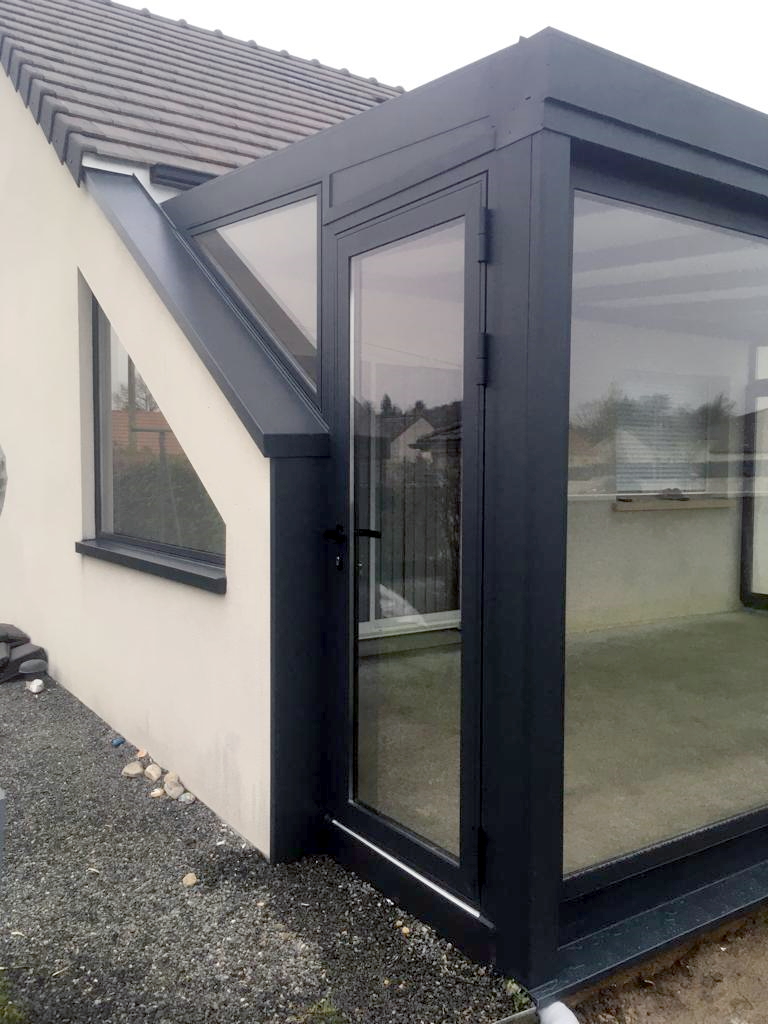 Fabrication et installation đȘ d'une vĂ©randa gris anthracite avec une toiture droite sur la commune de Gourdon.