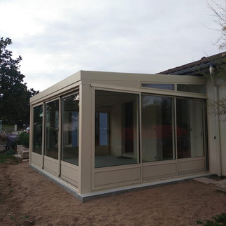 Fabrication et pose d'une véranda beige sur la commune de Chauffailles.